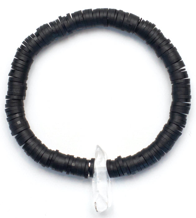 Lily's latest crystal creation! Black 6mm heishi beads with a clear crystal quartz stone is just so cool!