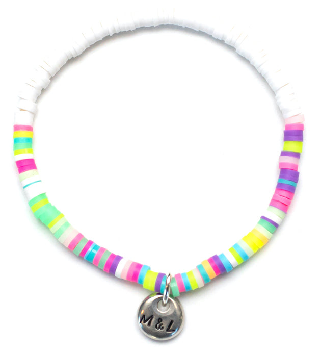 If you’re in need of some brightness in your jewelry box, you’re in luck! This bright piece uses neon 4mm heishi beads and our favorite “M&L” tag!