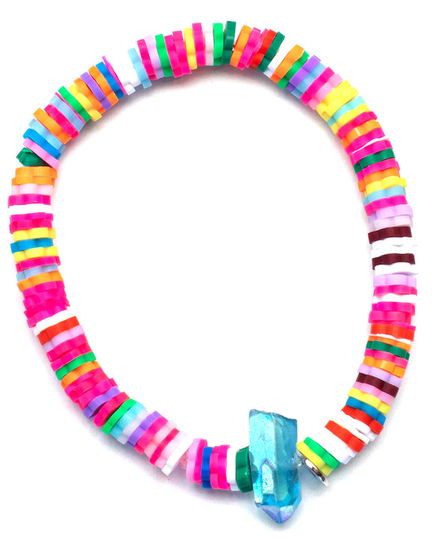 The most colorful 6mm heishi beads shaped like flowers paired with a beautiful blue quartz crystal 🌸