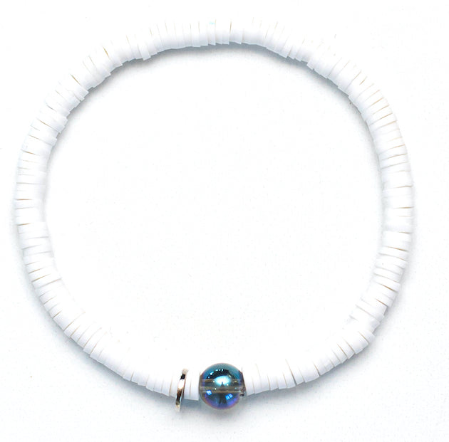Mom’s favorite! Bright white 4mm heishi beads with our favorite Swarovski crystal stone is the perfect piece for stacking!