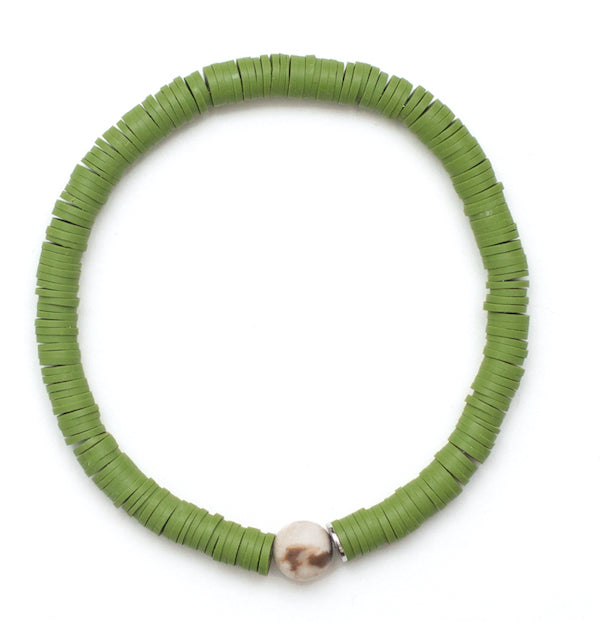 Lovely dark green 6mm heishi beads with an earth tone stone gives us cozy fall vibes🍁