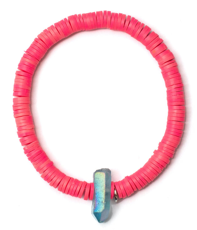 Meet our colorful newest addition! Β Made by Molly with pink 6mm heishi beads and a blue titanium quartz crystal!